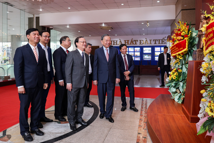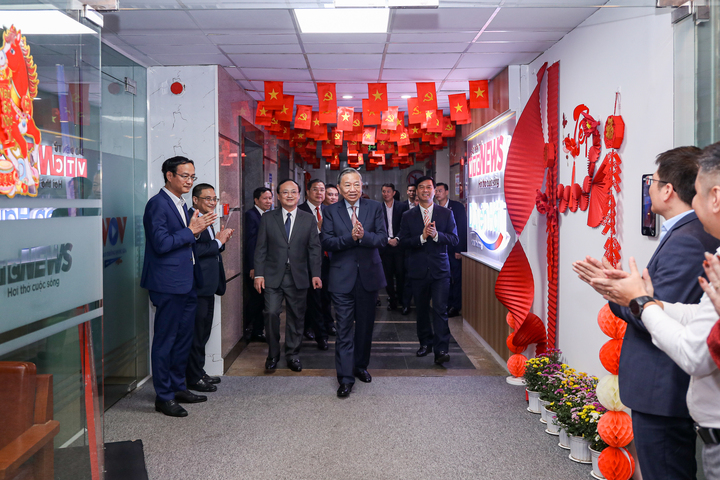 Tổng Bí thư Tô Lâm chia sẻ: "Trong thời khắc thiêng liêng chuẩn bị đón Tết Nguyên đán, mỗi một gia đình đang sum vầy, trên dọc các tuyến đường rực rỡ sắc xuân, tôi xúc động đến thăm, động viên cán bộ, công nhân viên, các kỹ thuật viên, phát thanh viên, người lao động Đài TNVN cùng chia sẻ với các đồng chí, những người đang canh trời giữ sóng, giữ nhịp thông tin cho đất nước, cho quốc gia, kịp thời đến với từng người dân, từng địa bàn từng khu vực, không chỗ nào không có tiếng nói Việt Nam".