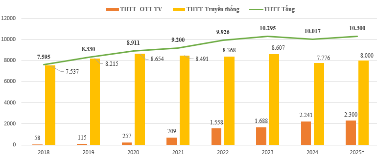 Đến hết năm 2024, tổng thuê bao truyền hình trả tiền đạt 21,4 triệu, tăng 2% so với cùng kỳ năm 2023 (21 triệu); trong đó thuê bao OTT TV là 9,16 triệu tăng trên 24,1% so với năm 2023 (7,38 triệu). Doanh thu thuê bao dịch vụ OTT TV cả năm 2024 đạt 2.241 tỷ đồng, tăng 32,8% so với năm 2023 (1.688 tỷ đồng). Tuy nhiên, doanh thu thuê bao dịch vụ truyền hình trả tiền truyền thống giảm lớn hơn phần tăng của dịch vụ OTT TV, nên doanh thu thuê bao toàn thị trường năm 2024 chỉ đạt 10.017 tỷ đồng, giảm 2,7% so với năm 2023 (10.295 tỷ đồng), đóng góp khoảng 3,5% giá trị sản xuất của 12 ngành công nghiệp văn hóa nước ta.