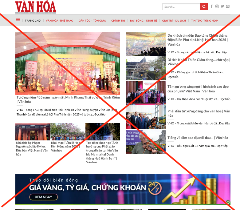“Cục Phát thanh, truyền hình và thông tin điện tử thông qua công tác kiểm tra, rà soát, đánh giá nội dung thông tin trên website https://vanhoadisan.com nhận thấy có đăng tải thông tin giả mạo Báo Văn Hóa; tổng hợp thông tin bài đăng trái phép; hoạt động cung cấp thông tin tổng hợp trên trang điện tử không có giấy phép theo quy định của Nghị định số 147/2024/NĐ-CP ngày 9.11.2024 của Chính phủ về Quản lý, cung cấp, sử dụng dịch vụ internet và thông tin trên mạng”, văn bản nhấn mạnh.